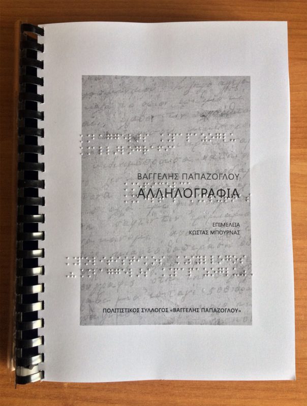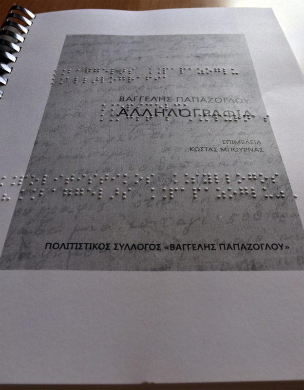 Η έκδοση του Συλλόγου «Βαγγέλης Παπάζογλου: Αλληλογραφία» είναι πλέον διαθέσιμη και σε γραφή Μπράιγ για τα άτομα που είναι τυφλά ή έχουν μειωμένη όραση. Ευχαριστούμε θερμά το KEAT Κέντρο Εκπαίδευσης και Αποκατάστασης Τυφλών (πρώην Σχολή Τυφλών) που πραγματοποίησε τη μετατροπή και την εκτύπωση.